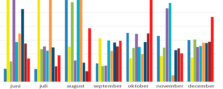 Se eksempelvis de store udsving i oktober og december 2014 sammenholdt med de øvrige år. Klimatilpasning har i mange kommuner derfor indtaget dagsordenen.