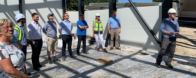 Anette Storm, direktør i DS Flexhal er stolt over, at virksomheden - ved at opføre den 500 m2 store hal - giver et konkret bidrag i det spændende projekt. Som traditionen byder, skulle der smadres et glas og udfoldes et længe leve for den nye bygning.