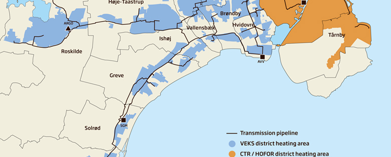 VEKS Transmission supplies 19 local district heating companies with heat in Vestegnen. The local district heating companies manage the redistribution to private customers, business customers and institutions. The heat supplied is equal to the consumption of 170,000 families.