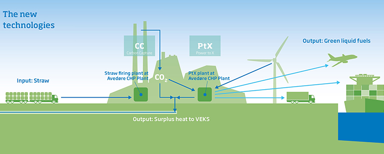 Various energy companies in the Greater Copenhagen area already cooperate with respect to the new technologies, CC (Carbon Capture) and PtX (Power-to-X). This takes place in VEKS’ supply area – at first, in the straw-fired boiler at Avedøre CHP Plant. Here, VEKS, CTR, Ørsted and HOFOR work together on two parallel development projects which will contribute to the green transition by testing technologies of the future.